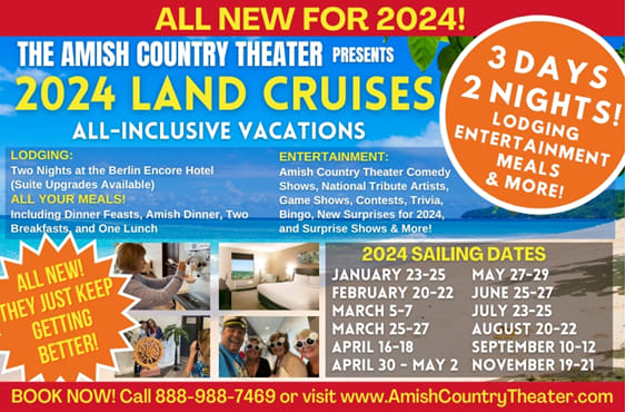 “Come Sail Away” with the gang at the Amish Country Theater as we set sail on an All-Inclusive vacation for the ages! It’s all blue skies and sunshine as you experience a vacation adventure you won’t soon forget! Some of what you’ll experience on board: Award-winning family variety shows from the Amish Country Theater cast Incredible food. When your mouth’s not laughing, it will be eating! Desserts to die for! The now-famous 24/7 soft serve ice cream (Lynyrd’s favorite) Hilarious, all-new audience-interactive game shows Big-Time Bingo and Brainiac Trivia Backstage theater tours Late-night comedy with Lynyrd Shows, shows, and more shows (you’ll never run out of stuff to do)! Relaxation by the fireplace or in the indoor swimming pool. And much, much, MUCH more! FOOD, GLORIOUS FOOD! All your favorite food – and more of it! We’ve introduced and all-new menu including an Amish-style home-cooked meal, late night desserts, ice cream, great snacks and appetizers, and a whole lot more! And the beauty of this all-inclusive vacation experience is: You won’t have to spend a dime once you’re on board. It’s all the food and all the fun! So make your reservation now and join us for a voyage you’ll never forget! You won’t have to spend a single penny once you’re on our land cruise. It’s all-inclusive, and it’s all-sorts-of-fun! So make your reservations now and join Lynyrd (Your Cruise Director) and his crazy cast of friends on a voyage you won’t soon forget! Includes 2 nights at the Berlin Encore Hotel & Suites in a Deluxe Single King or 2 Queen. Suite upgrades are available.Images