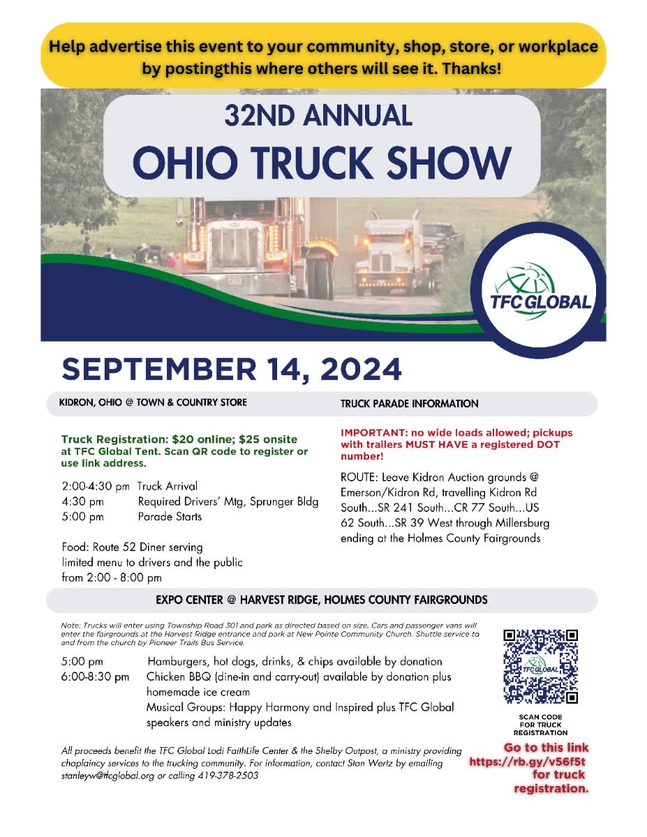 All proceeds benefit the TFC Global Lodi FaithLife Center & the Shelby Outpost, a ministry providing chaplaincy services to the trucking community. For information, contact Stan Wertz by emailing stanleyw@tfcglobal.org or calling 419-378-2503Images