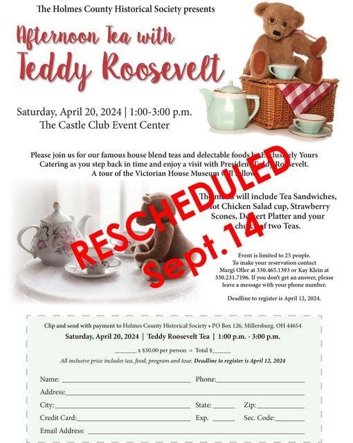 Please join us for our famous house blend teas and delectable foods by Exclusively Yours Catering as you step back in time and enjoy a visit with President Teddy Roosevelt. A tour of the Victorian House Museum will follow. The menu will include Tea Sandwiches, Hot Chicken Salad cup, Strawberry Scones, Dessert Platter, and your choice of two Teas. To make your reservation contact Margu Oller at 330-465-1393 or Kay Klein at 330-231-7196. If you don't get an answer please leave a message with your phone number.Images