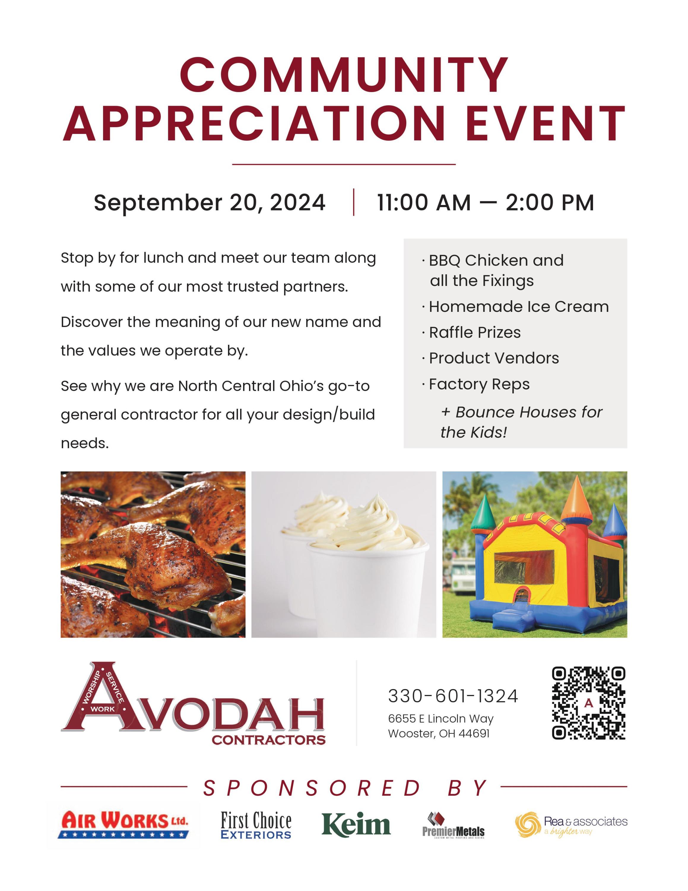 Stop by for lunch and meet our team along with some of our most trusted partners. Discover the meaning of our new name and the values we operate by. See why we are North Central Ohio’s go-to general contractor for all your design/build needs. - BBQ Chicken and all the Fixings - Homemade Ice Cream - Raffle Prizes - Product Vendors - Factory Reps + Bounce Houses for the Kids!Images