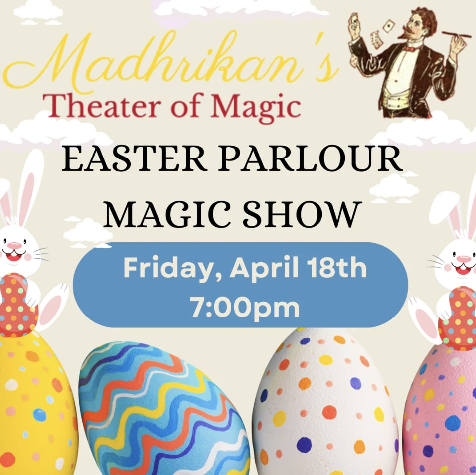 Celebrate Easter with Madhrikan's one-man magic show this Easter Weekend! Madhrikan performs in a unique, intimate setting, bringing together masterful close-up magic, as well as enchanting storytelling and the fascinating history of magic and magicians. Madhrikan is not only a great magician, but a magic historian with a vast knowledge of the colorful and amazing performers and their stories.