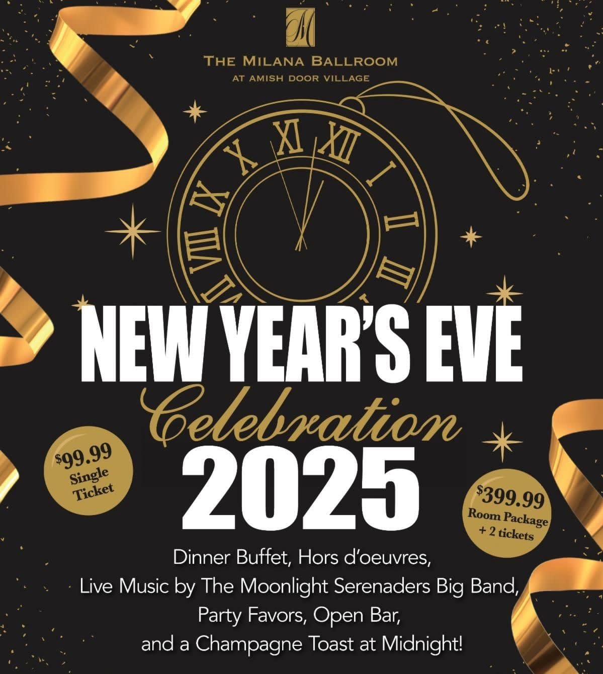 Join us in the Milana Ballroom at the Amish Door Village for a New Year's Eve Celebration on December 31, 2024. Tickets include our All-You-Can-Eat Dinner Buffet, Hors d'oeuvres, Live Music by The Moonlight Serenaders Big Band and a Champagne Toast at Midnight!
