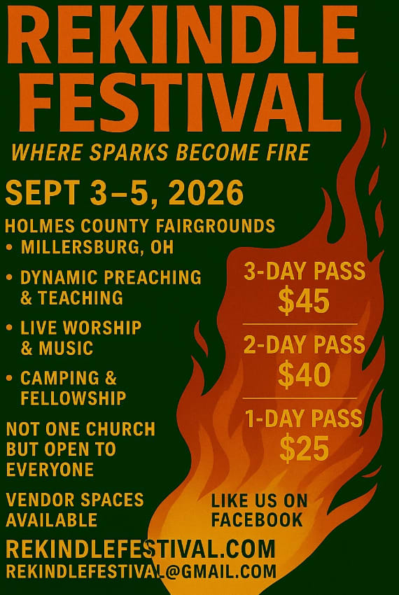Rekindle Festival is more than just an event—it’s a 3 day statewide revival where Christians from every background can come together for: ✨ Dynamic preaching & teaching ✨ Live worship & music ✨ Camping & fellowship ✨ Unity across churches and denominations This is not about one church—it’s about the Body of Christ uniting to lift up Jesus and ignite a fire in Ohio that will not go out.Images
