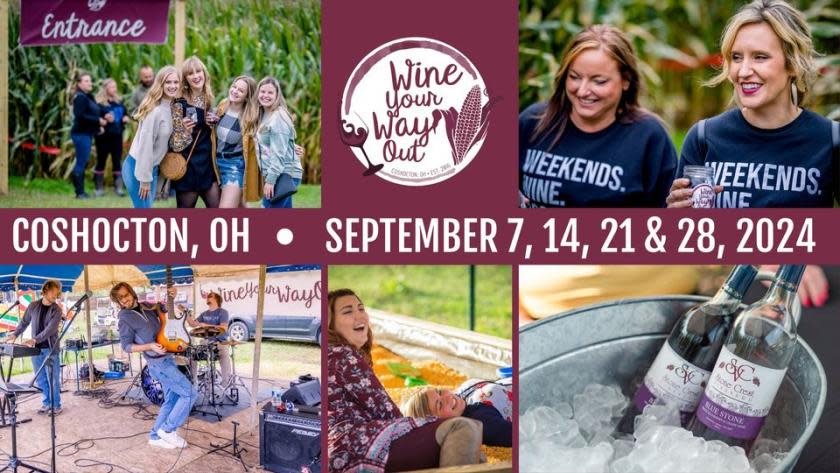 2024 Wine Your Way Out® Dates: Saturdays, September 7*, 14, 21 & 28 *New in 2024! September 7th will be Wine Your Way Out® x Beer Maze - for this special WYWO date, you can choose between wine or beer for tasting in the corn maze. ------- Let the wine guide you out of the giant corn maze! Since 2016, Wine Your Way Out® has been a wine tasting event held at McPeek's Mighty Maze corn maze at Coshocton KOA, featuring excellent Ohio wineries. Enter the maze, find the wine stations and enjoy the variety of wines in each station. Finish the night around a campfire & enjoy a glass of your favorite wine at the cash bar. There will also be live music and food truck each night of the event. This is a fall adventure you don't want to miss! Learn more: www.wineyourwayout.comImages