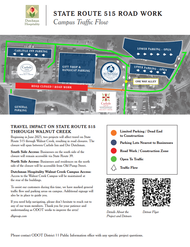 Der Dutchman Restaurant and the other Dutchman Hospitality Group locations along Main Street will remain open for business during a road improvement project that will impact traffic on campus.